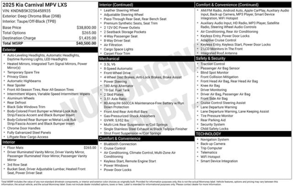 Recent Arrival! 2025 Kia Carnival LXS V6 8-Speed Automatic FWD 4D Passenger Van Deep Chroma Blue 3.51 Axle Ratio, 3rd row seats: split-bench, 4-Wheel Disc Brakes, 6 Speakers, 6.5J x 17" Alloy Wheels, ABS brakes, Air Conditioning, Alloy wheels, AM/FM radio: SiriusXM, Apple CarPlay & Android Auto, Artificial Leather Seat Trim, Auto High-beam Headlights, Automatic temperature control, Brake assist, Bumpers: body-color, Carpeted Floor Mats (8-Passenger), Compass, Delay-off headlights, Driver door bin, Driver vanity mirror, Dual front impact airbags, Dual front side impact airbags, Electronic Stability Control, Emergency communication system, Exterior Parking Camera Rear, Four wheel independent suspension, Front anti-roll bar, Front Bucket Seats, Front Center Armrest, Front dual zone A/C, Front reading lights, Fully automatic headlights, Heated door mirrors, Heated Front Bucket Seats, Heated front seats, Illuminated entry, Knee airbag, Leather Shift Knob, Leather steering wheel, Low tire pressure warning, Navigation system: AVN 5.0 Navigation System, Occupant sensing airbag, Outside temperature display, Overhead airbag, Overhead console, Panic alarm, Passenger door bin, Passenger vanity mirror, Power door mirrors, Power driver seat, Power steering, Power windows, Radio: AM/FM/HD Audio System, Rear air conditioning, Rear anti-roll bar, Rear reading lights, Rear window defroster, Rear window wiper, Reclining 3rd row seat, Remote keyless entry, Security system, Speed control, Speed-sensing steering, Split folding rear seat, Spoiler, Steering wheel mounted audio controls, Tachometer, Telescoping steering wheel, Tilt steering wheel, Traction control, Trip computer, Turn signal indicator mirrors, Variably intermittent wipers.