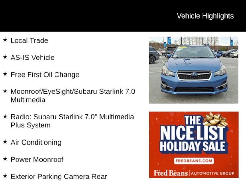 Discover the perfect balance of performance, technology, and style in this 2015 Subaru Impreza 2.0i Sport Premium. With its impressive all-wheel-drive capabilities, efficient 2.0L 4-cylinder engine, and a wealth of premium features, this Impreza is ready to elevate your driving experience.