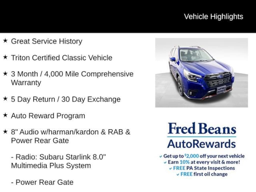 At our dealership, we're committed to delivering an exceptional customer experience. With our Auto Reward Program, you'll have the opportunity to earn exclusive benefits and rewards with every visit. We invite you to come in and experience the 2023 Subaru Forester Sport for yourself. Let us demonstrate how this remarkable SUV can enhance your driving lifestyle.