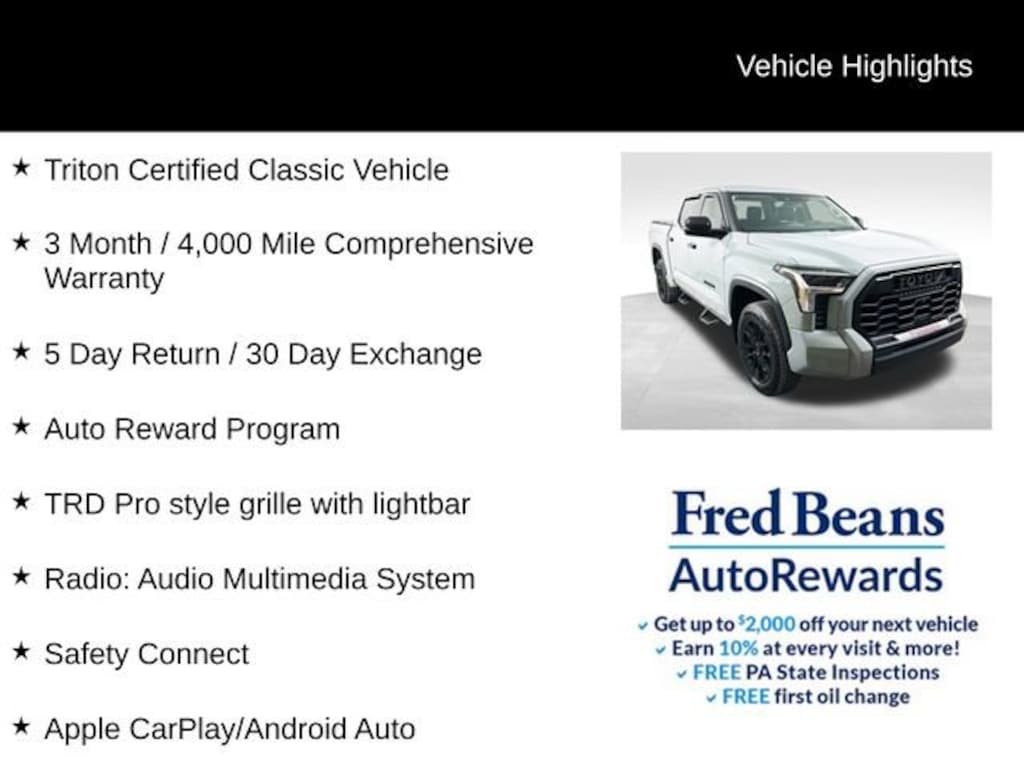 Elevate your driving experience with this exceptional 2024 Toyota Tundra SR5. Boasting a powerful 3.4L V6 engine paired with a smooth 10-speed automatic transmission and capable 4WD, this Tundra is ready to tackle any adventure. Triton Certified Classic Vehicle 3 Month / 4,000 Mile Comprehensive Warranty 5 Day Return / 30 Day Exchange Auto Reward Program TRD Pro style grille with lightbar Radio: Audio Multimedia System Safety Connect Apple CarPlay/Android AutoStep inside and surround yourself with premium features, including a state-of-the-art infotainment system, 9-speaker audio, and advanced safety technologies like Automatic High-Beam Headlights and Rear Camera. The Tundra's spacious cabin and versatile split-folding rear seat ensure you can comfortably accommodate passengers and cargo alike.This Tundra SR5 is more than just a capable truck it's a testament to Toyota's renowned quality and reliability. As a Triton Certified Classic Vehicle, it has undergone a rigorous inspection and comes with a comprehensive warranty, giving you the peace of mind you deserve.Imagine the possibilities with this impressive 2024 Toyota Tundra SR5. With its exceptional performance, advanced technology, and Triton Certified status, this truck is poised to elevate your driving experience to new heights. Visit us today to take this remarkable Tundra for a test drive and discover why it's the perfect companion for your next adventure.Backed by Toyota's reputation for dependability and our commitment to customer satisfaction, this Tundra SR5 is an exceptional value. Experience the difference for yourself and let us show you why this truck should be at the top of your list.